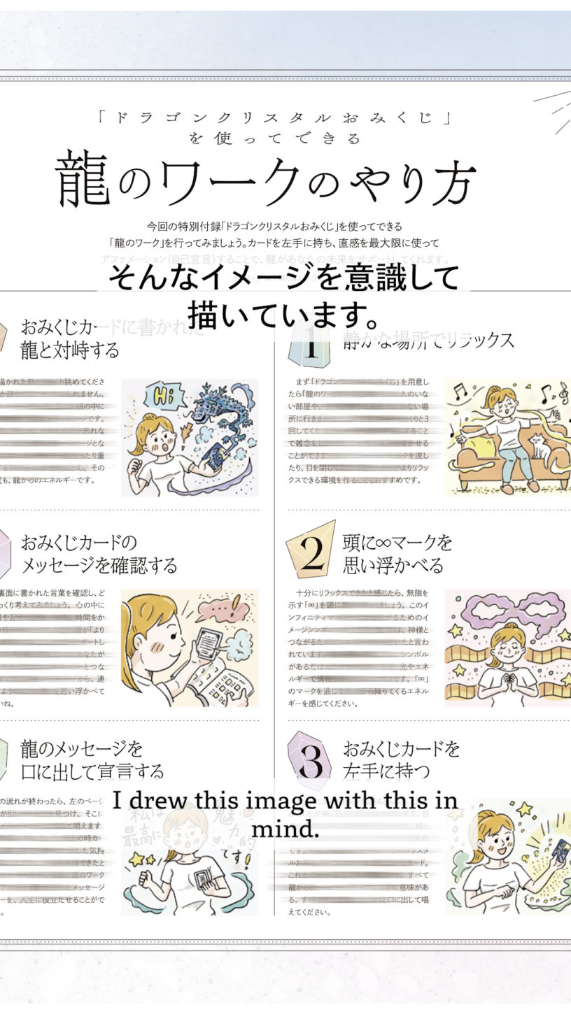 Dragons have a mysterious presence and feel as if they can dispel hesitation, and this work truly embodies that impression. By relaxing, calming the mind, and speaking your personal message out loud, it incorporates elements of meditation and affirmation, making it feel genuinely effective. I kept this sense in mind while creating the illustrations. I hope to recharge my own energy as well and move forward with a positive mindset.