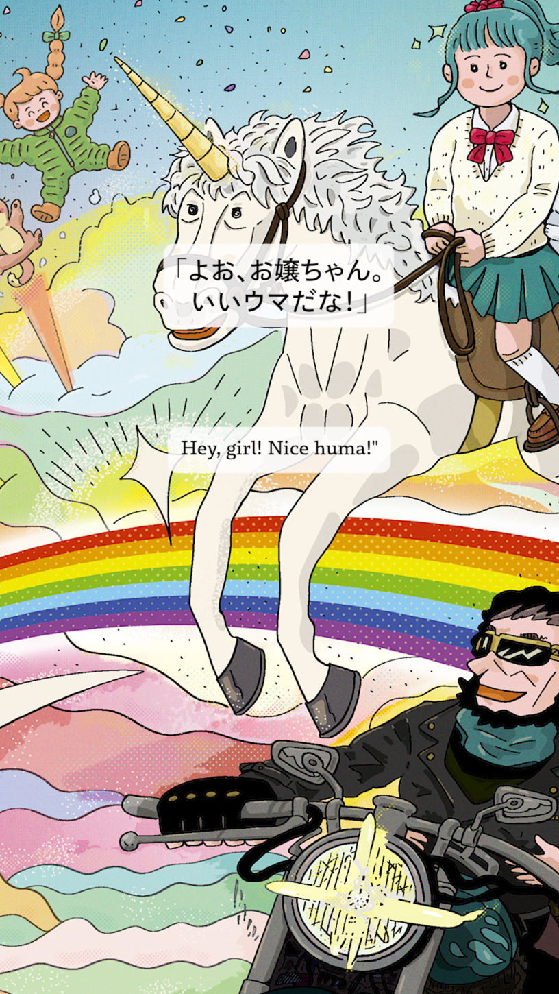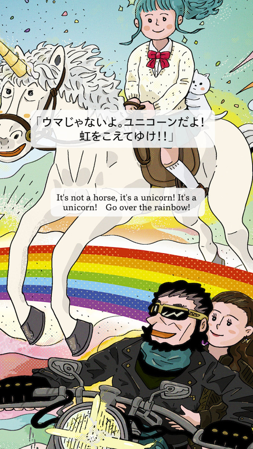 「ウマじゃないよ。ユニコーンだよ! 虹をこえてゆけ!!」
